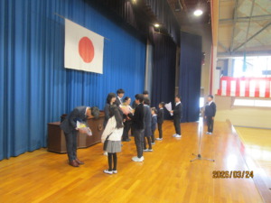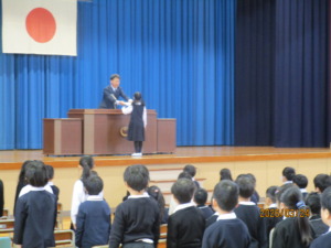 修了式が行われ、各学年の代表が校長から修了証をいただきました。1年間の節目を迎え、代表児童は、晴れやかな表情で修了証を受け取りました。