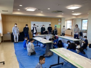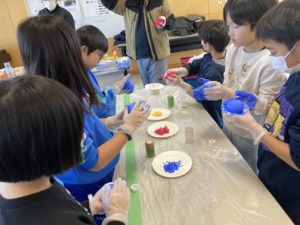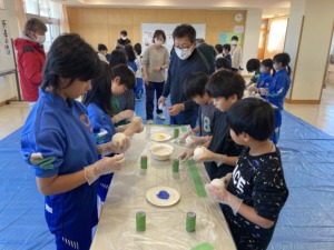 ものづくりマイスターや熟練技能士の左官の方たちが作ってくださったきれいな丸の泥団子の上に白い漆喰を塗り付け、その上から色のついた漆喰を塗りました。泥団子を光らせるために、一生懸命磨き、一人一人色が異なる泥団子となり、とても楽しい体験となりました。