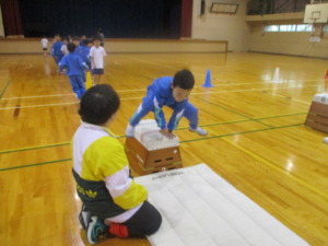 本校では、プレイリーダー体育教室として講師の先生をお招きし、跳び箱の学習を行いました。子供たちは、専門の先生から跳び箱の踏み切り方や手の付き方、身体の使い方を分かりやすく教えていただき、意欲的に取り組む姿が見られました。